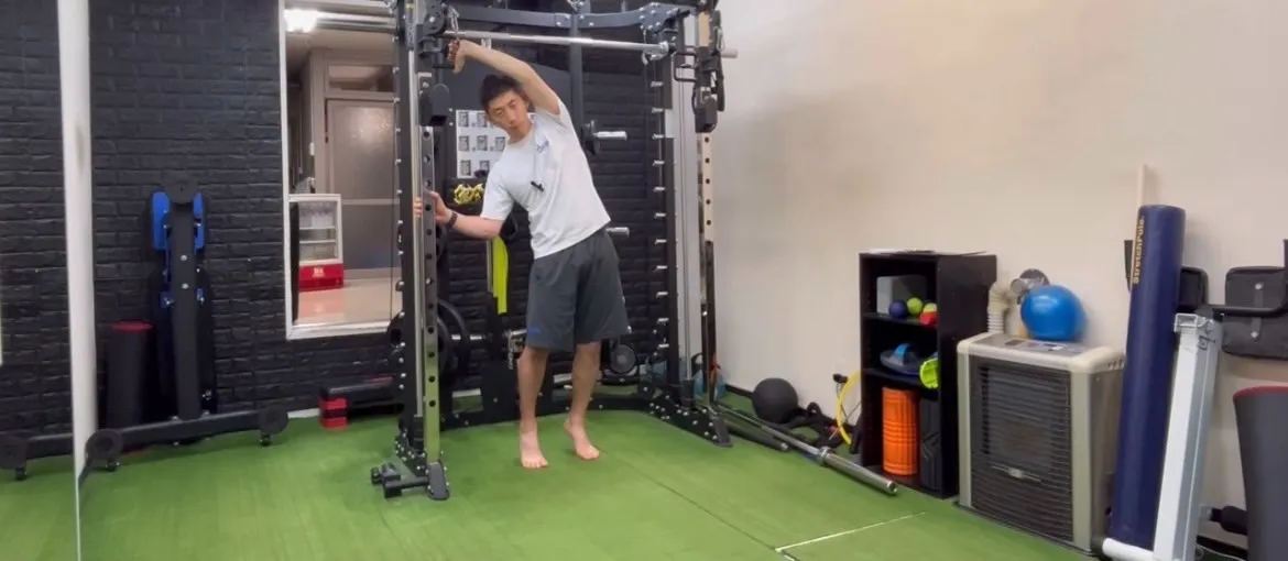 1、壁の横に立ち壁を押すイメージで体幹を側屈します