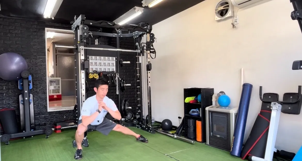 2、脚を横に大きく一歩踏み出し、つま先・膝・骨盤を正面に向けて重心を落とし、太腿の内側とお尻の筋肉を使って衝撃を吸収します。