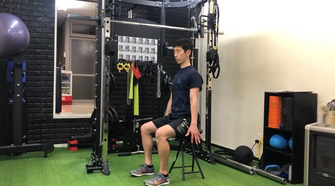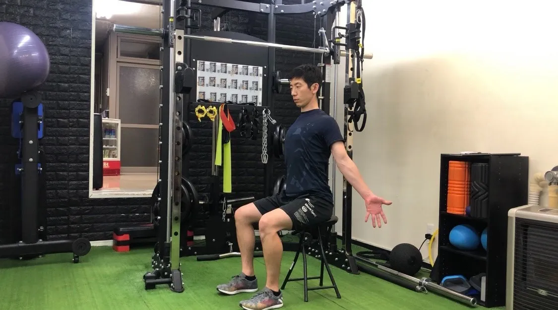 1、イスにお尻の骨で座るイメージで骨盤を立てて背筋を伸ばします
