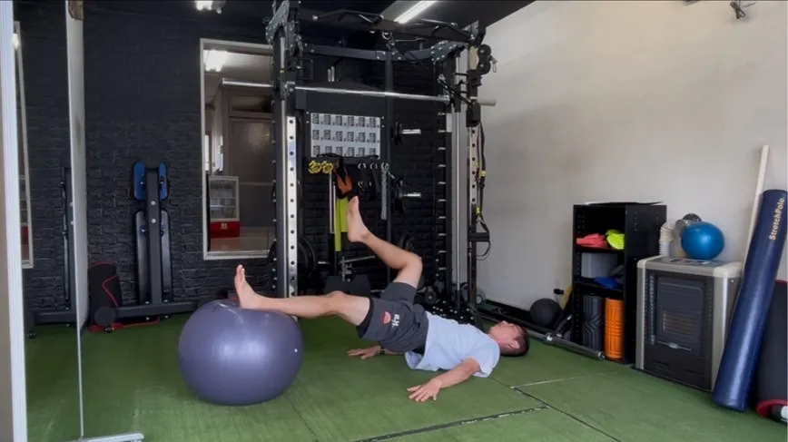 バランスボール・シングルレッグカール(ハムストリングの“伸ばされながら耐える力”を強化)